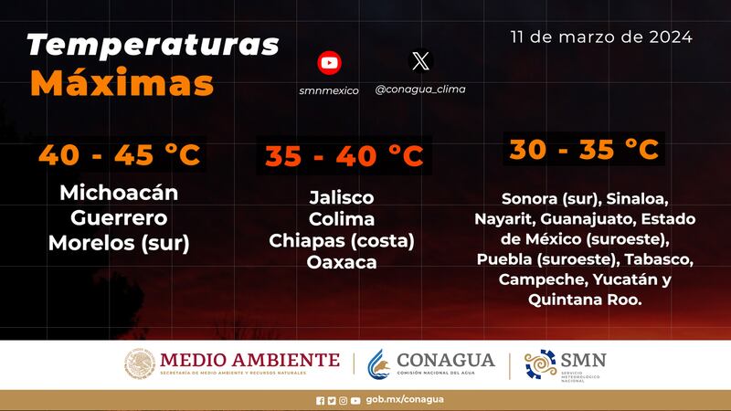 - Temperaturas máximas de 35 a 40 grados: Nayarit, Jalisco, Colima, Chiapas (costa), Campeche, Yucatán y Quintana Roo.