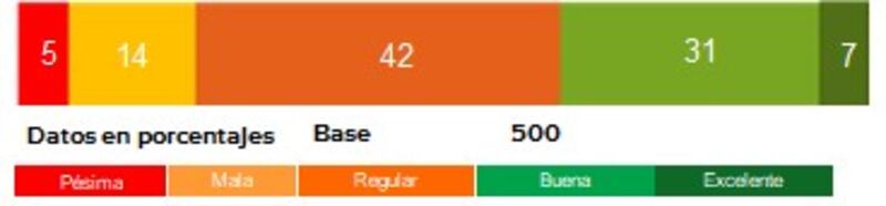Al preguntar ¿cómo calificarías la calidad de los servicios de salud públicos que has recibido en los últimos cinco años? El 4 por ciento respondió que es regular, el 31 por ciento como buena y el 7 por ciento excelente. Sin embargo, hay un 19 por ciento que la califica como mala a pésima. La calificación de mala a pésima es similar para el IMSS y el ISSSTE.