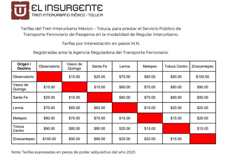 El costo del viaje en el Tren Interurbano dependerá del punto desde donde lo tomes y la zona a la que te dirijas. De acuerdo con la tabla de precios del Tren Insurgente, difundida por el Gobierno de México, el costo máximo será de 100 pesos mexicanos de extremo a extremo.