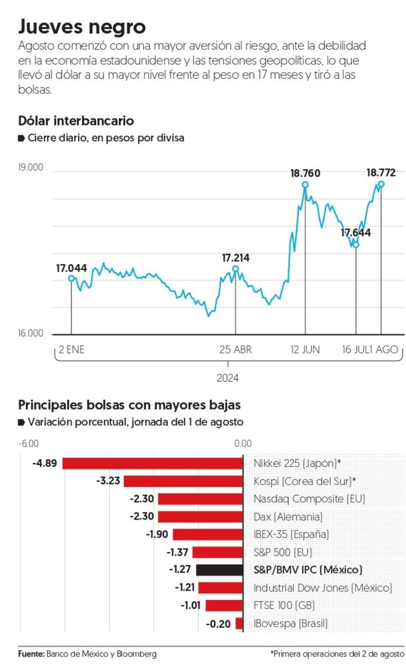 Los mercados accionarios a nivel global y las divisas de mercados emergentes, entre ellas el peso mexicano, reportaron ayer fuertes pérdidas, ante las débiles cifras de la economía estadounidense, que alertaron a los inversionistas. En Asia, las bolsas iniciaron este viernes con un desplome liderado por el índice bursátil de Japón.