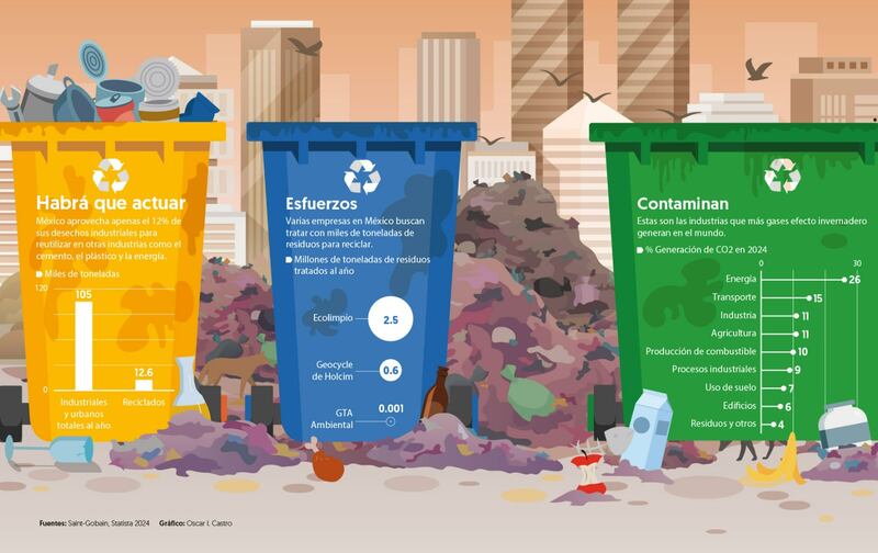 En México se desaprovecha la oportunidad de reutilizar y procesar residuos industriales como aceites, neumáticos, pinturas, disolventes, baterías, desechos urbanos, plásticos y trapos contaminados, envases, plásticos, tintas, entre otros, para suministrar de materiales a otras industrias como la construcción, el cemento, embotelladoras y de energía limpia.