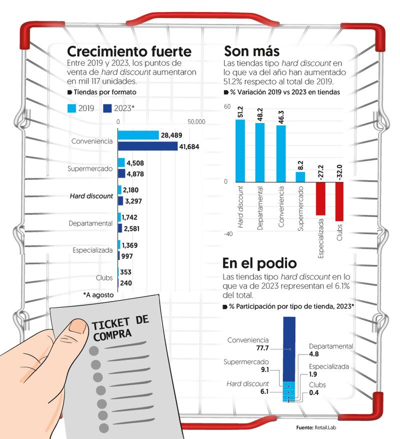 Entre 2019 y lo que va de este año los puntos de venta de hard discount pasaron de 2 mil 180 a 3 mil 297 sucursales, arrojó un análisis de la consultora Retail Lab.
