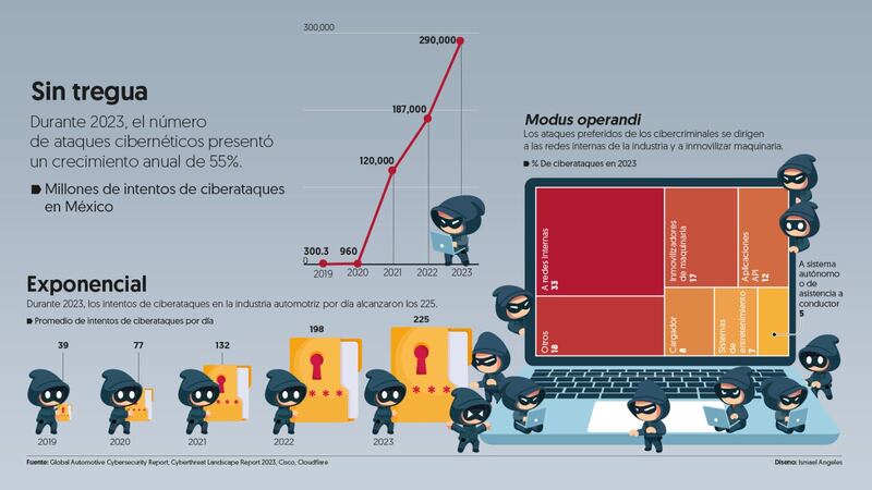 De acuerdo con el Global Automotive Cybersecurity Report, elaborado por Upstream, en los últimos 12 meses, las empresas del sector automotor fueron blanco de un promedio de 225 intentos de ciberataques por día, de los cuales, 50 por ciento fueron catalogados como posibles incidentes de alto impacto o masivo para la industria.
