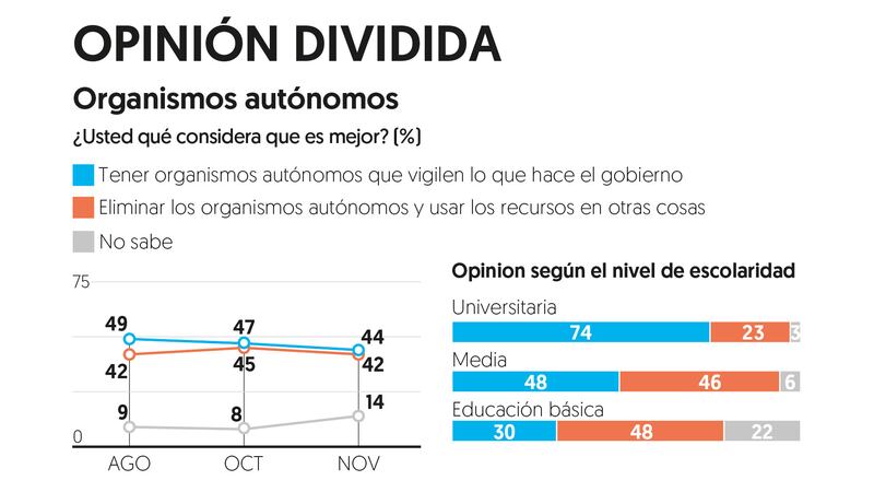 De acuerdo con una encuesta nacional de El Financiero realizada en noviembre, 44 por ciento de las personas consultadas considera que lo mejor para el país es tener organismos autónomos que vigilen lo que hace el gobierno, mientras que 42 por ciento opina que es mejor eliminar dichos entes y usar los recursos en otras cosas. Esta división de opiniones se observó también en agosto y octubre, cuando entre 49 y 47 por ciento de personas se manifestó a favor de tener organismos autónomos, y entre 42 y 45 por ciento estuvo del lado de su eliminación.