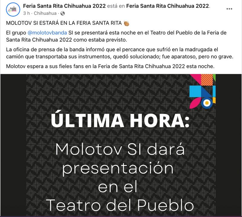 ”La oficina de prensa de la banda informó que el percance que sufrió en la madrugada el camión que transportaba sus instrumentos, quedó solucionado; fue aparatoso, pero no grave. Molotov espera a sus fieles fans en la Feria de Santa Rita Chihuahua 2022 esta noche”, anunció.
