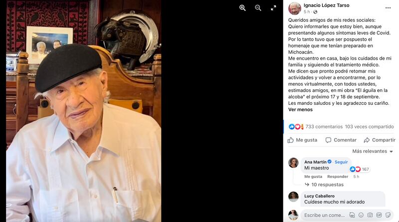 “Queridos amigos de mis redes sociales: Quiero informarles que estoy bien, aunque presentando algunos síntomas leves de covid. Por lo tanto, tuvo que ser pospuesto el homenaje que me tenían preparado en Michoacán”, detalló en el breve comunicado.