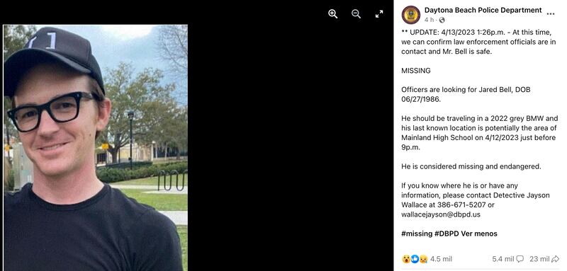 Tras la emisión de un boletín sobre la desaparición de Drake Bell, la policía de Daytona Beach actualizó la ficha de búsqueda para informar al público que el actor ya había sido localizado y estaba a salvo.