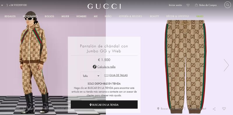 El pants con el que hace juego se vende aparte, es del mismo color y línea: logo de la marca en grande a lo largo y ancho de la prenda, mientras las franjas rojas y verdes las tiene en los costados. Este tiene un costo de mil 500 euros; es decir, 29 mil 600 pesos aproximadamente.