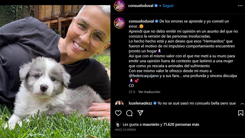 “Así que con el mismo valor con el que me metí a su muro para emitir una opinión fuera de contexto que lastimó a una mujer que como yo rescata a animales del sufrimiento, con ese mismo valor le ofrezco desde mi muro a Federica Quijano y a sus fans una profunda y sincera disculpa”, sentenció Consuelo.