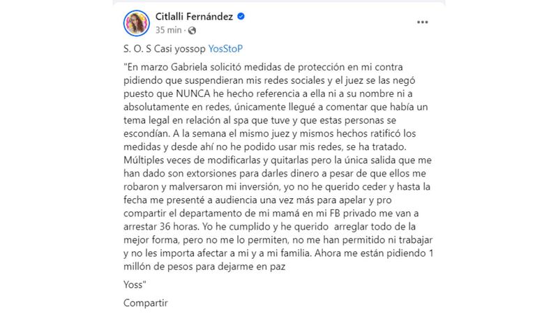 La activista Citlali Fernández, fundadora de la asociación Ave Fénix, compartió un mensaje firmado por la influencer YosStop, en el que se señala que no puede usar sus redes sociales porque están secuestradas, además de que no usarlas forma parte de uno de los acuerdo de las medidas cautelares.