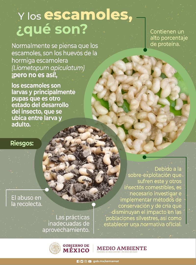 Los escamoles son conocidos popularmente como ‘caviar mexicano’, ya que se considera muy valioso, costoso y exquisito, también se les llama hueva de hormiga, maicitos, guijes o iujis; usualmente se recolectan en Cuaresma y se encuentran en la base del maguey, nopaleras o junto a árboles de pirul.