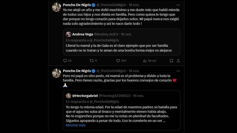 “Pero como quiera le tengo que dar porque no tengo corazón para dejarlos solos. Mi papá nunca nos exigió nada, solo agradecimiento y así te nace darle todo... Mi papá es otro pedo, mi mamá es el problema y divide a toda la familia", dijo en X en uno de los mensajes donde expresó su enojo.