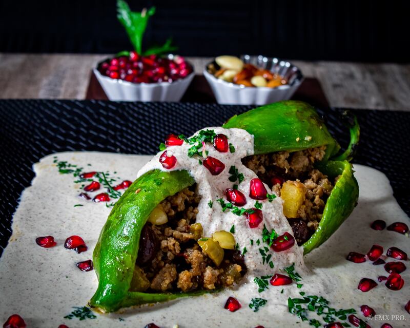 La especialidad son los chiles en nogada que, aunque suele ser un sabor de temporada, aquí lo hacen durante todo el año, con carne molida de res y cerdo, almendras, pasas y aceitunas, capeado y bañado con una salsa de nuez de castilla.