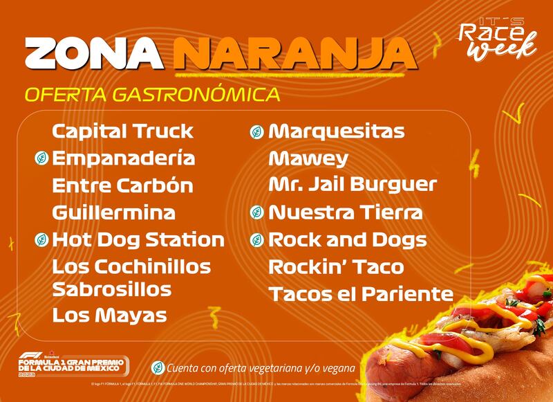 La oferta gastronómica para el GP de México de este año incluirá tacos, pizzas, comida japonesa, mariscos, cortes de carne, hamburguesas, hot dogs, snacks y algunas otras opciones.