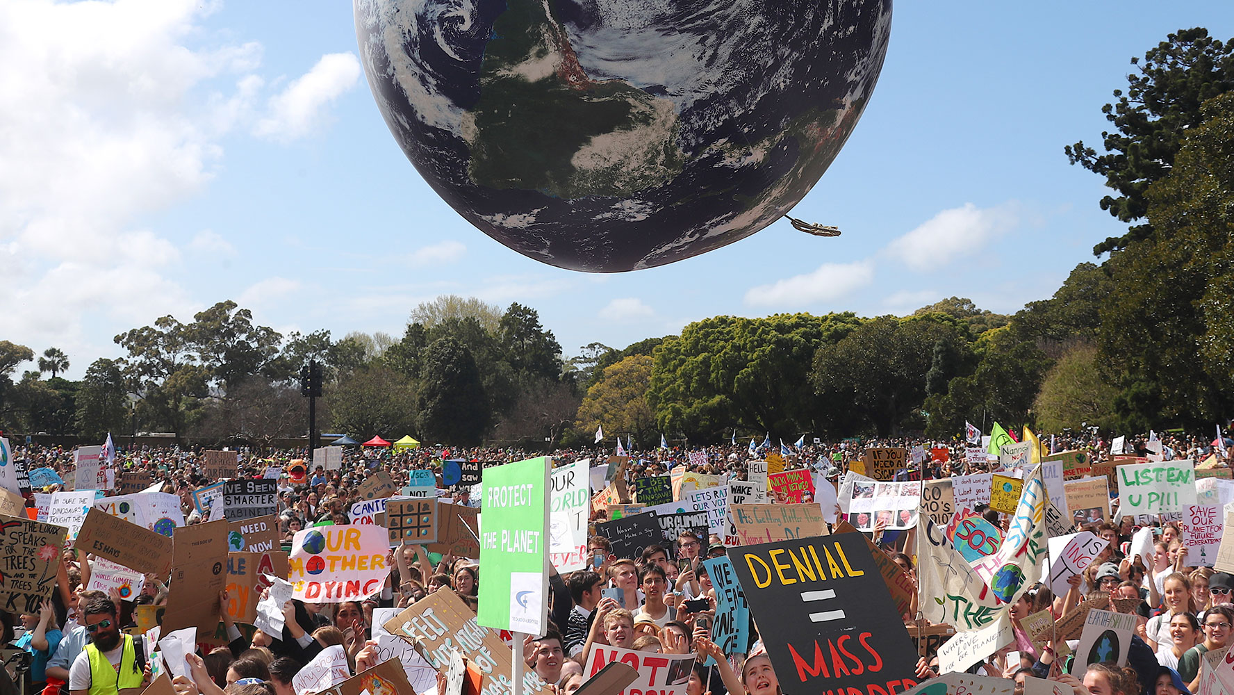 Manifestantes empujan un globo inflable en el aire mientras sostienen pancartas durante la manifestación Global Climate Strike en Sydney, Australia. / Bloomberg