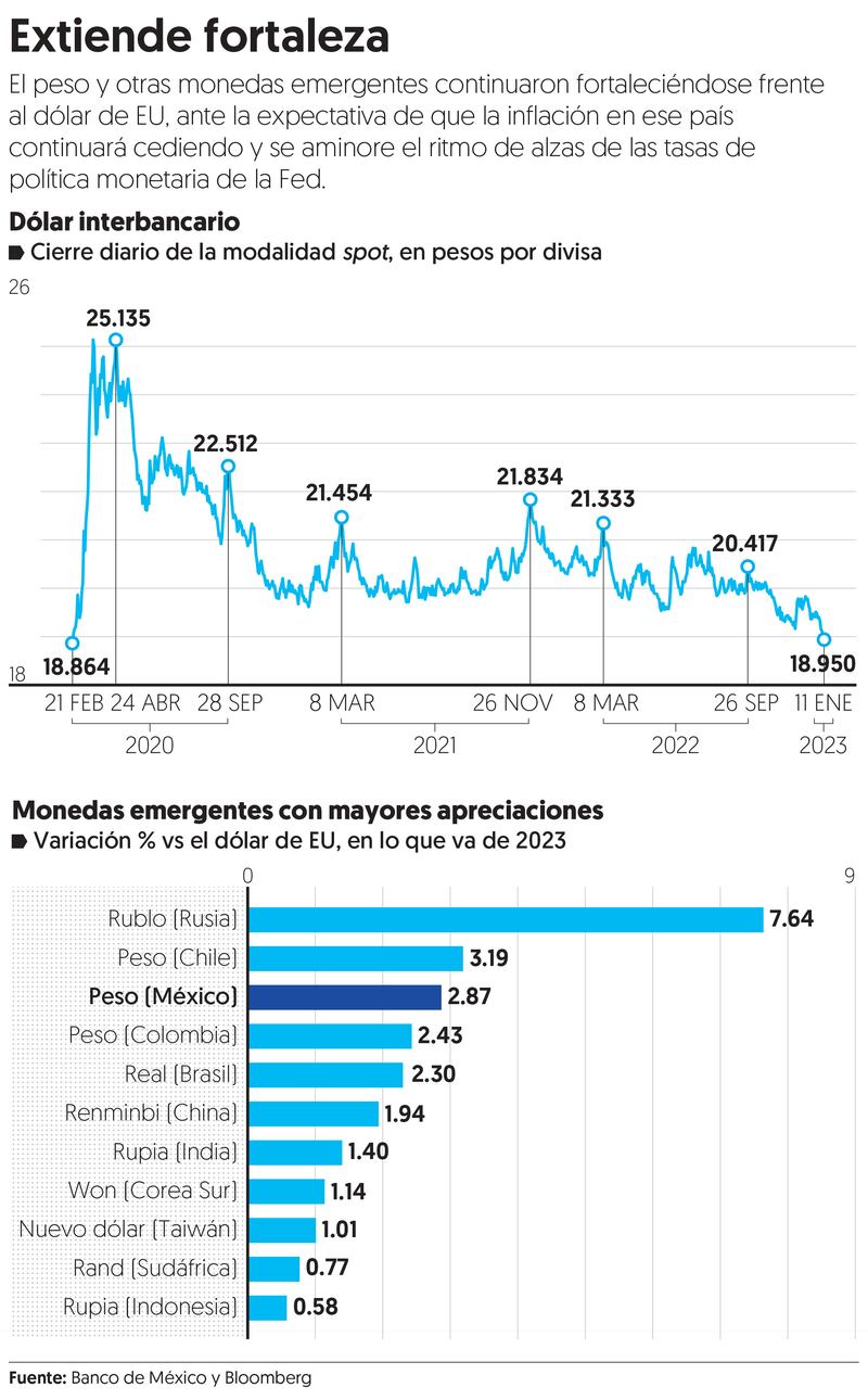 Por su parte, James Salazar indicó que si se cumple la expectativa de que se siga moderando la inflación, la fortaleza del peso puede durar hasta que venga la Reserva Federal, el primero de febrero, con sus anuncios, pues seguramente ahí otra vez externará un mensaje duro.