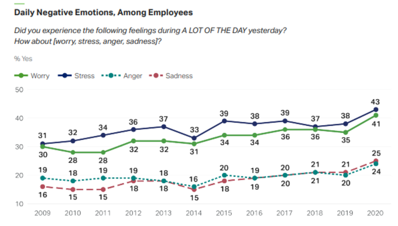 Otro sentimiento negativo que se incrementó fue el del estrés. De un mínimo de la serie de 31% manifestado en 2009, para el año de 2020 este nivel fue de 43%. En cuanto a la tristeza, pasó de un nivel mínimo en 2014 de 15% a un nivel de 25% en el 2020, mientras que el año anterior (2019) se reportó solo un 21%.