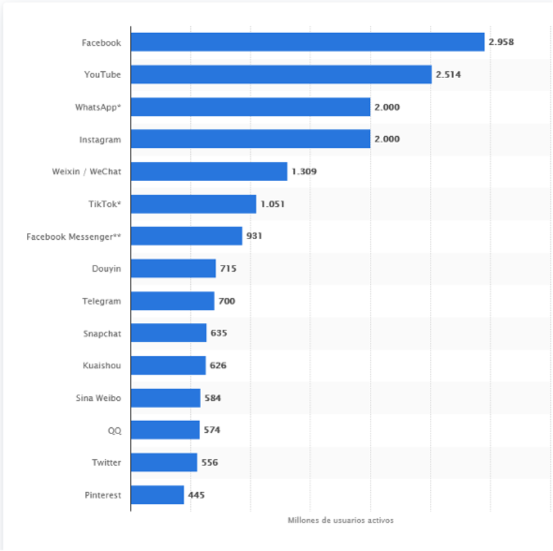 La siguiente grafica publicada por el Statista (2023) nos permite ver las redes sociales on mayor número de usuarios activos a nivel mundial, al mes de enero del 2023