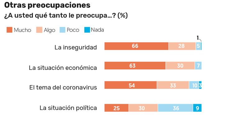 Según el estudio, la inseguridad preocupa mucho al 66 por ciento de los entrevistados, mientras que la situación económica preocupa mucho al 63 por ciento y el coronavirus al 54 por ciento.
