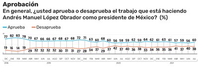 La aprobación ciudadana al presidente Andrés Manuel López Obrador tuvo un ligero repunte en el mes de julio, al registrar 60 por ciento, 4 puntos más que en el mes anterior. La desaprobación registró 38 por ciento, según la más reciente encuesta nacional de EL FINANCIERO.