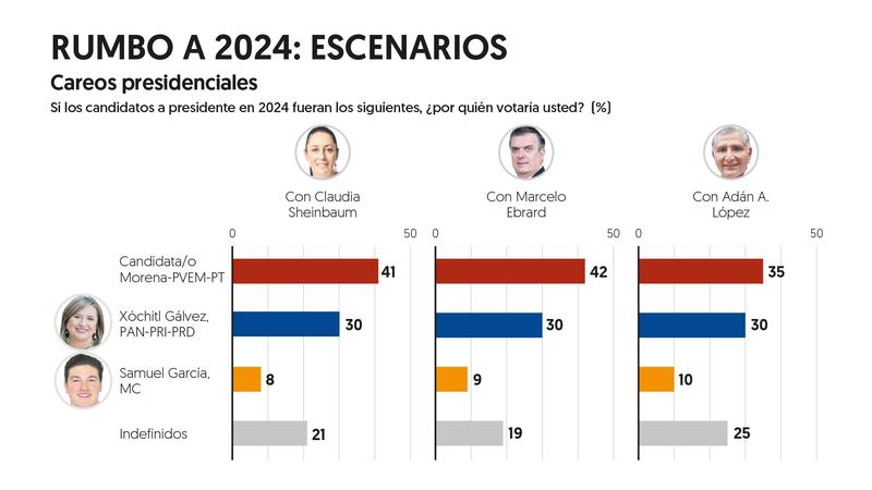 En un posible proceso electoral con tres candidatos, es decir, el o la que gane el proceso interno de Morena más Xóchitl Gálvez, las preferencias por García van de un rango de 8 por ciento (si la abanderada guinda es Claudia Sheinbaum) a 10 por ciento (si el candidato de la 4T es Adán Augusto López).