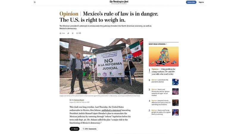 Este lunes, el periódico publicó un editorial con el que abrió su sección de opinión y en el que resaltó que los cambios que busca el mandatario ponen en riesgo la independencia judicial y que también afecta la relación con Estados Unidos.
