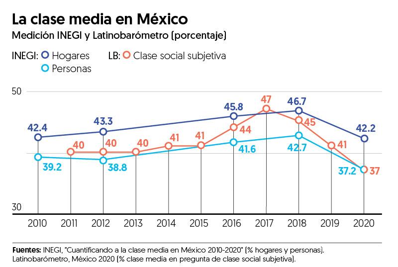 De acuerdo con los datos del Latinobarómetro, la identidad de clase media en México se mantuvo entre 40 y 41 por ciento entre 2011 y 2015, subió a 47 por ciento en 2017, se redujo ligeramente a 45 por ciento en 2018 y bajó hasta 37 por ciento en 2020 (misma cifra que Inegi reporta como porcentaje de personas de clase media en el país en ese año). El parecido en los porcentajes y en la evolución de estas medidas objetiva (Inegi) y subjetiva (Latinobarómetro) de clase media es simplemente formidable.