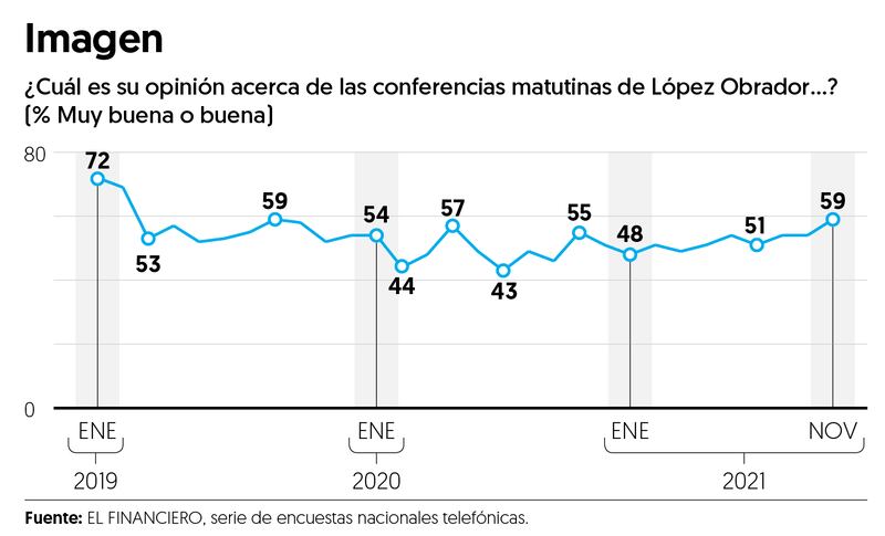 1. Al inicio, las mañaneras gustaron mucho, pero sufrieron un fuerte desgaste en imagen durante el primer año de gobierno. A nivel nacional, la opinión favorable bajó de 72 a 44 por ciento, entre enero de 2019 y febrero de 2020, según las encuestas de EL FINANCIERO. Daba la impresión de que sería muy difícil sostenerlas con ese deterioro de imagen, pero también por lo que implican física, logística y discursivamente.