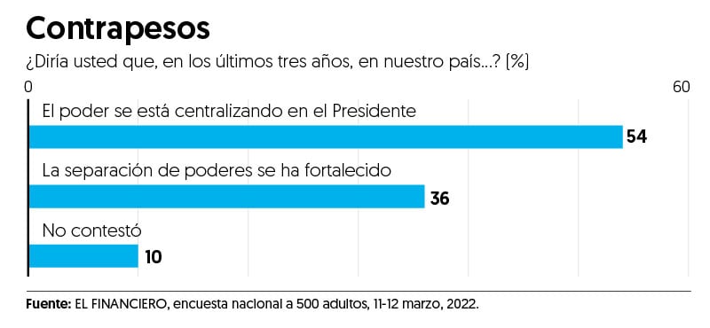El tema de la separación de poderes lo medimos este mes en la encuesta nacional de EL FINANCIERO. El 36 por ciento de los mexicanos cree que en el país la separación de poderes se ha fortalecido en los últimos tres años, mientras que 54 por ciento, la mayoría, considera que el poder se ha centralizado en el Presidente. El dato confirma la tendencia registrada por el índice Bertelsmann en ese rubro.