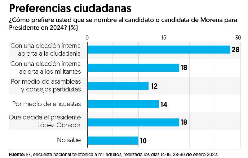 En enero pasado, les preguntamos a mil personas en una encuesta nacional de EL FINANCIERO cómo prefieren que se nombre al candidato o candidata de Morena para presidente en 2024. Las opciones de respuesta consideraban como métodos las elecciones internas, ya sea abiertas a toda la ciudadanía o sólo a los militantes, las asambleas y consejos partidistas, las encuestas y la designación directa por parte del presidente de la República.