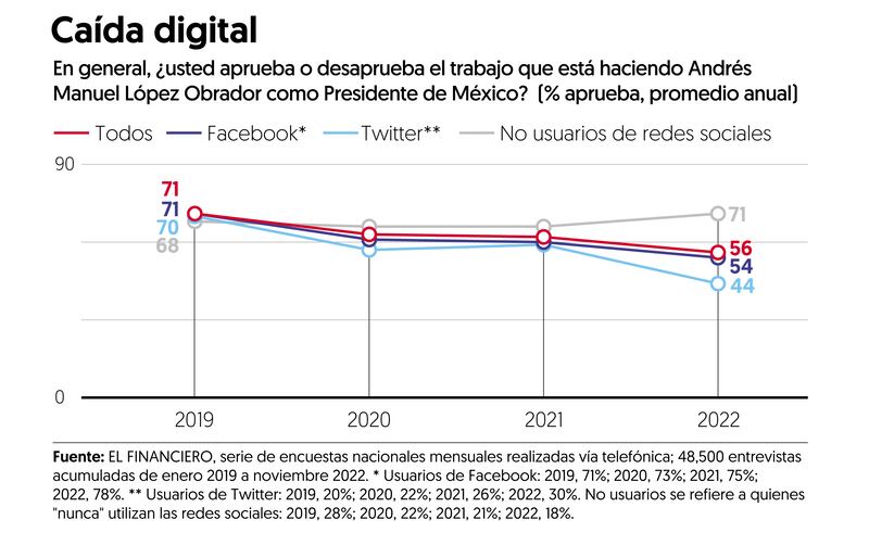 La caída más marcada se observa entre usuarios de Twitter, entre quienes la aprobación bajó 26 puntos porcentuales entre 2019 y 2022, al pasar de 70 por ciento a 44 por ciento en los primeros 11 meses de este 2022.