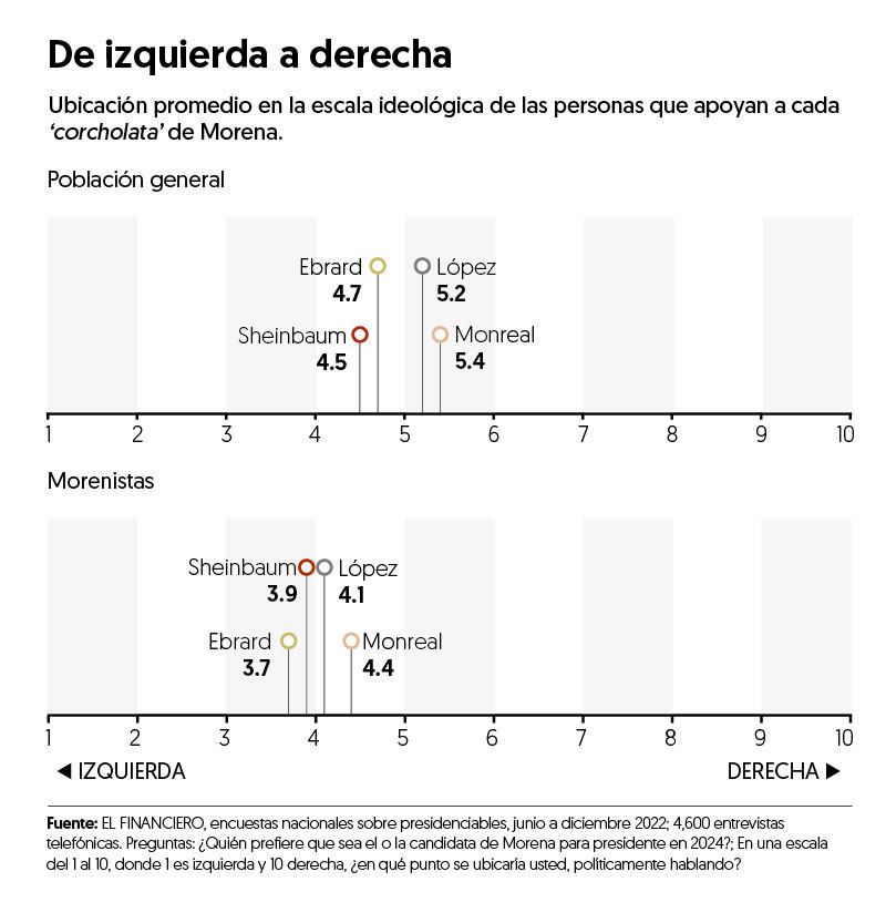 Ebrard cuenta con el apoyo más extremo entre morenistas, pero se ubica a la derecha en comparación de Sheinbaum entre la población general, lo cual significa que jala más electores centristas que la jefa de Gobierno. Para el canciller, la apuesta sería afianzar al electorado centrista sin alienar a los ideológicos.