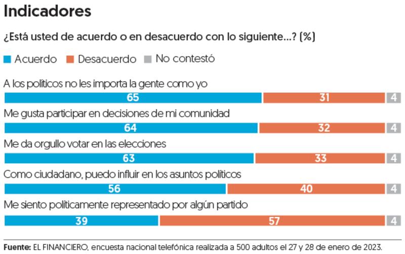 El orgullo de votar en elecciones y la idea de que, como ciudadanos y ciudadanas, se puede influir en los asuntos políticos, son actitudes mayoritarias entre la sociedad mexicana hoy en día. Ambas denotan una cultura política participativa y un sentido de empoderamiento ciudadano, o eficacia política interna, como le llaman en la ciencia política. Sin embargo, estas actitudes contrastan con una amplia creencia, también mayoritaria, de que a los políticos “no les importa la gente como yo”, indicativo de una baja eficacia política externa.