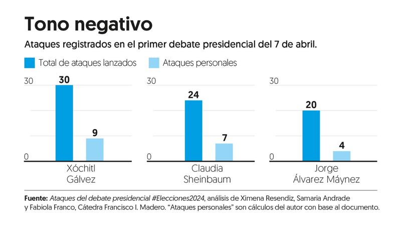 De acuerdo con un análisis realizado por especialistas de la Cátedra Francisco I. Madero, el debate tuvo un total de 74 ataques: 30 de ellos los lanzó la candidata Xóchitl Gálvez, 24 Claudia Sheinbaum y 20 Jorge Álvarez Máynez.