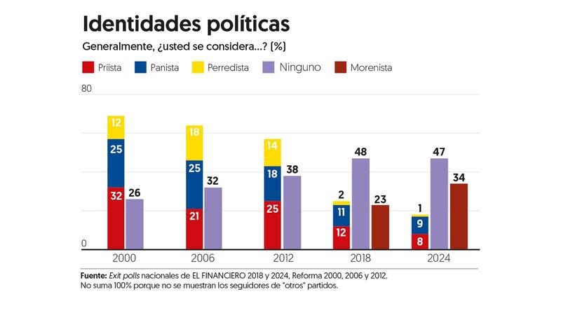 De acuerdo con los exit polls que me ha tocado coordinar, la distribución de los partidismos ha pasado por varias etapas: el debilitamiento del PRI, el fortalecimiento de PAN y PRD, el declive de esos tres partidos y el surgimiento de las nuevas identidades morenistas que, en buena medida, se montaron tanto en el obradorismo como en las deserciones de los otros partidos, principalmente del PRI y el PRD.