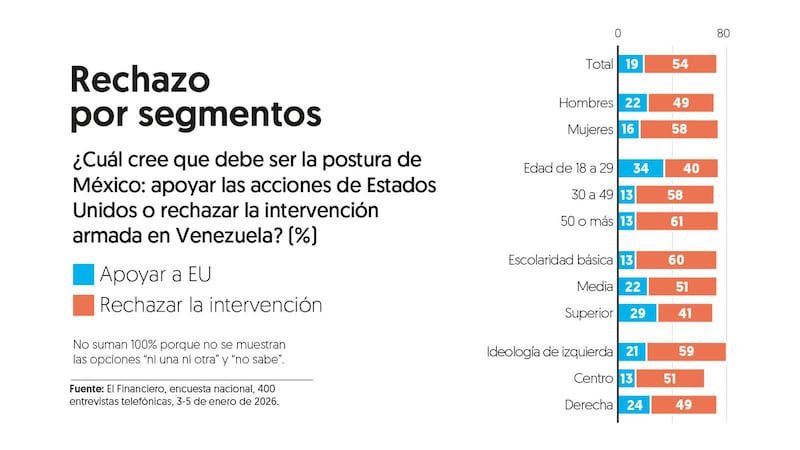 Por lo pronto, la encuesta de EL FINANCIERO sobre las acciones militares en Venezuela, publicada el martes pasado, reveló que la mayoría de la opinión pública mexicana no vio justificación en lo sucedido y expresó un rechazo a la intervención de Estados Unidos en el país sudamericano.