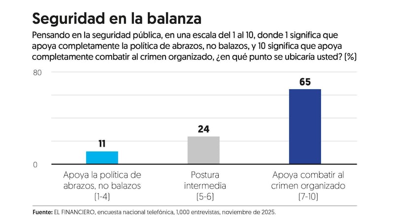 Por ejemplo, en noviembre de 2025, la encuesta nacional de El Financiero preguntó lo siguiente: “Pensando en la seguridad pública, en una escala del 1 al 10, donde 1 significa que apoya completamente la política de abrazos, no balazos, y 10 significa que apoya completamente combatir al crimen organizado, ¿en qué punto se ubicaría usted?”.