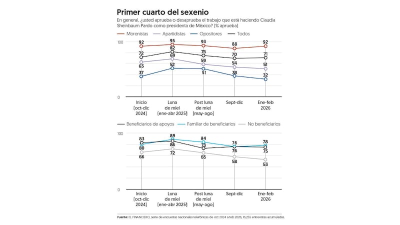 En los primeros dos meses de 2026, la tendencia a la baja se detuvo, especialmente después del operativo en Jalisco, con el cual se registró un leve rebote en la aprobación. No obstante, el rebote agregado se dio principalmente entre morenistas, que pasaron de 88 a 92 por ciento de aprobación a la presidenta, mientras que entre opositores y apartidistas nuevamente hubo un deslizamiento a la baja, a 32 y 51 por ciento, respectivamente.