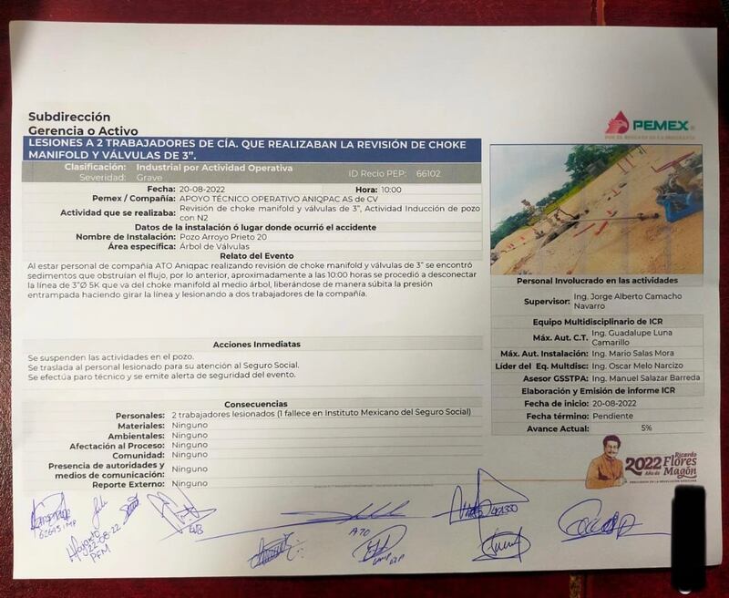 Hoy, a más de 20 días del suceso y aun cuando el fatal accidente quedó registrado en el ID Recio PEP: 66102 (imagen arriba) los funcionarios Gregorio Gil y Óscar Melo, acusa la denuncia, intentan manipular y entorpecer los procesos para cerrar la investigación y de esta manera evitar que la ANIQPAC sea sancionada, tal y como lo marca el Artículo 10, fracción VI, de las Disposiciones Generales de Contratación para Petróleos Mexicanos y sus Empresas Productivas Subsidiarias, debido a realizar trabajos en instalaciones de Pemex bajo un contrato sin vigencia y cuyo monto se encuentra agotado.