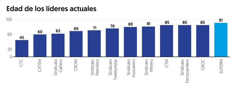 El envejecimiento de las dirigencias es otro rasgo destacado. La edad promedio de los actuales líderes sindicales es de 74.2 años, lo que confirma que gran parte del sindicalismo mexicano es encabezado por personas que han permanecido durante décadas en posiciones de mando.
