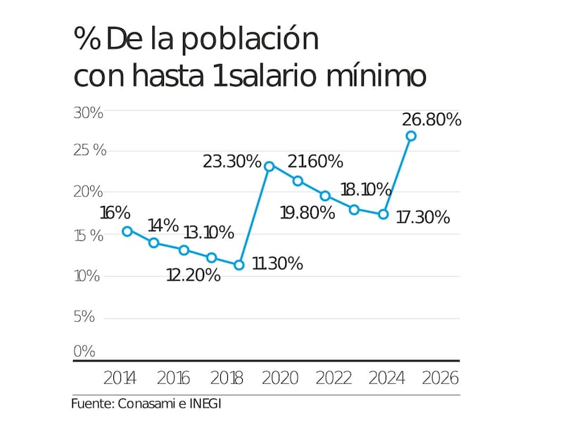 Con datos del Instituto Nacional de Estadística y Geografía (INEGI), específicamente con la Encuesta Nacional de Ocupación y Empleo (ENOE) y de la Comisión Nacional de Salarios Mínimos (CONASAMI), ambos publicados oportunamente en forma mensual, el número de personas que perciben salario mínimo casi se ha cuadruplicado entre el 2018 y el 2025, pasando de 4.5 millones a 16.2 millones. En porcentaje de población con salario mínimo, México ha pasado del 16 por ciento (2015) al 26.8 por ciento en el 2026 (más de 10 puntos porcentuales). Alguien se preguntará: ¿qué comportamiento tiene el grupo poblacional que gana más de uno y hasta dos minisalarios? Este grupo se ha desplomado, pasando de 8 millones en el 2018 a 2.7 millones en el 2025.