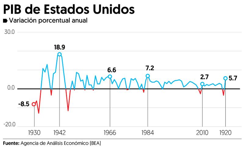 Si se analiza un gráfico con los datos anuales del PIB de EU desde 1930 hasta 2021, se observan 12 periodos en donde el PIB anual fue negativo. El ciclo económico dura en promedio 6.6 años en su fase de bonanza y rara vez se tiene más de un año de contracción económica. Este fenómeno de una recesión larga solo se dio en tres periodos, el de la Gran Depresión de principios de los años treinta, el de la Segunda Guerra Mundial y en los setenta cuando por el embargo petrolero y la inflación elevada de la época del presidente Carter la fase recesiva se profundizó.