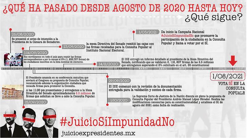 Tal cual se los comenté hace ocho días en el foro virtual de EL FINANCIERO, que condujo mi compañero Héctor Jiménez Landín, y a menos de un mes de que el INE lleve a cabo el capricho... ah no, perdón, la consulta ciudadana de juicio a expresidentes el próximo 1 de agosto, “ciudadanos preocupados por el porvenir de México”, así se autonombraron, han puesto en marcha una campaña negra para promover el voto masivo por el ‘Sí' bajo el lema #JuicioSíImpunidadNo.