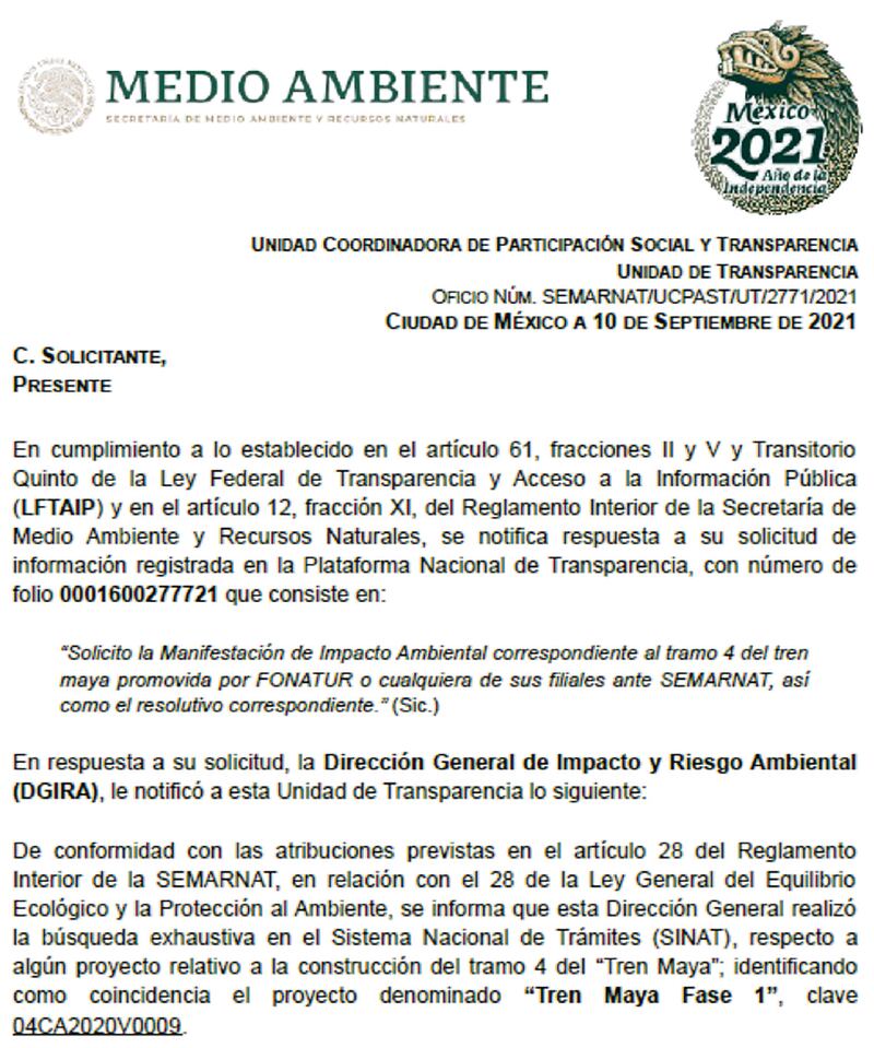 A finales de agosto y parte de septiembre de 2021, cuando me contestaron vía transparencia, el equipo de Jimmy Pons, de Fonatur, y sus filiales respondieron que, en la parte ambiental, los trabajos se sustentan en el resolutivo de la Manifestación de Impacto Ambiental Regional (MIA-R) y que la Manifestación de Impacto Ambiental para el tramo 4 –que va de Izamal a Cancún– se encuentra en proceso de elaboración, por lo cual no ha sido ingresada a la Dirección General de Impacto y Riesgo Ambiental en la Semarnat.