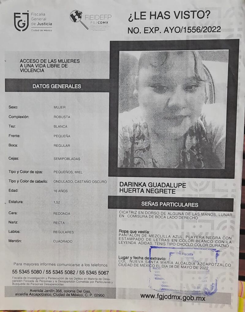 El domingo 8 de mayo, alrededor de las 5 p. m., me cuenta Salvador, su hermano, “estaba mi madre con mi hermana Darinka Guadalupe Huerta Negrete, en la colonia nueva Santa María en la calle Begonias, cuando mi madre se adelanta un poco por calle Membrillo y mi hermana, de 16 años de edad, se quedó atrás. Al pasar el tiempo ve mi madre que no llega mi hermana, algo sospechoso pues el domicilio está a 5 minutos de donde estaban. Entonces al ver que no aparece, la empieza a buscar, se levanta la denuncia y la llevan al C5 de la CDMX, pero solo le enseñan los videos de la calle Begonias y se ve que da vuelta en calle Nueces, pero no enseñan las grabaciones de dicha calle y hasta hoy seguimos sin saber de ella”. Ojalá, Omar García Harfuch y la fiscal Ernestina Godoy puedan ayudarlos a encontrar a Darinka.