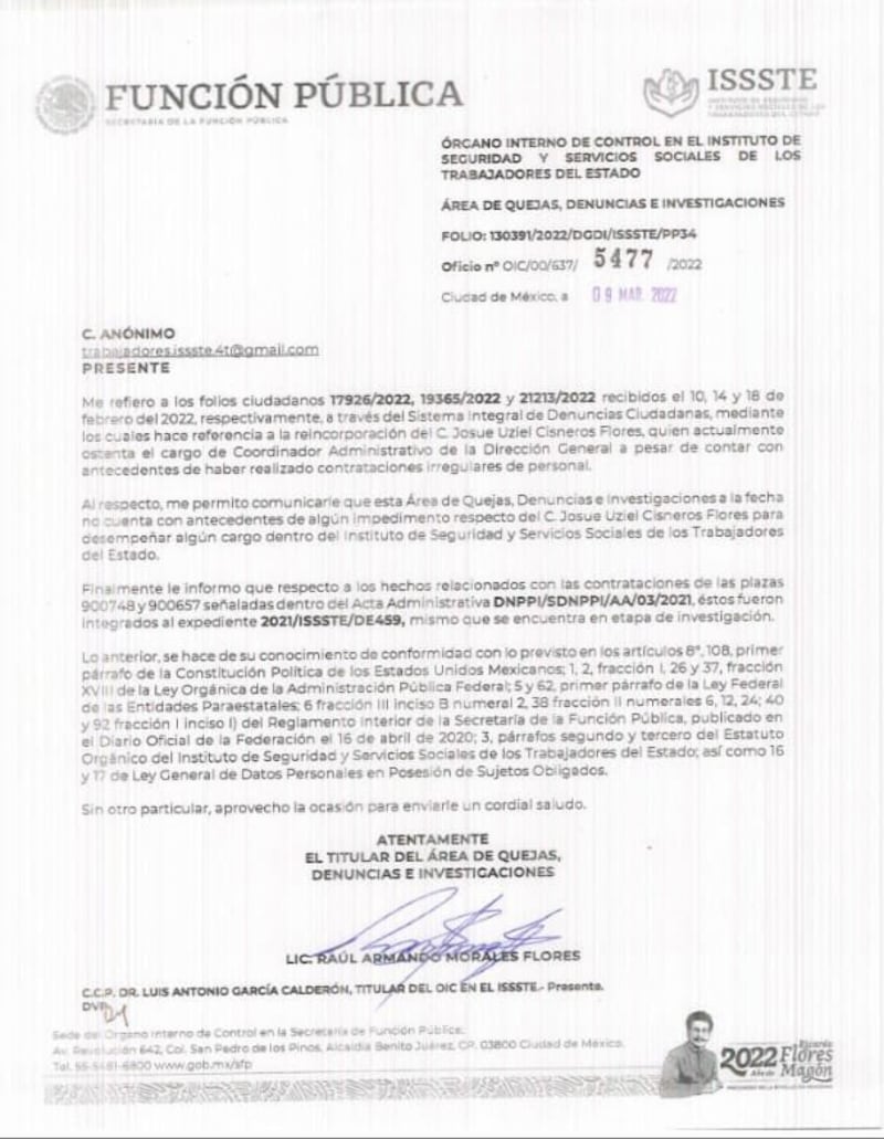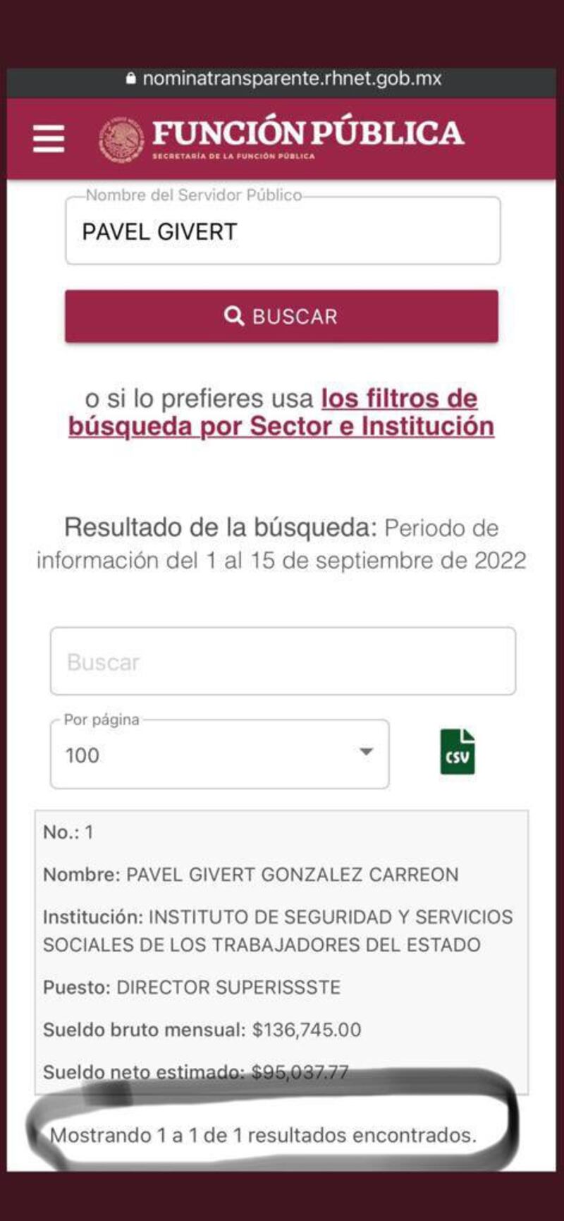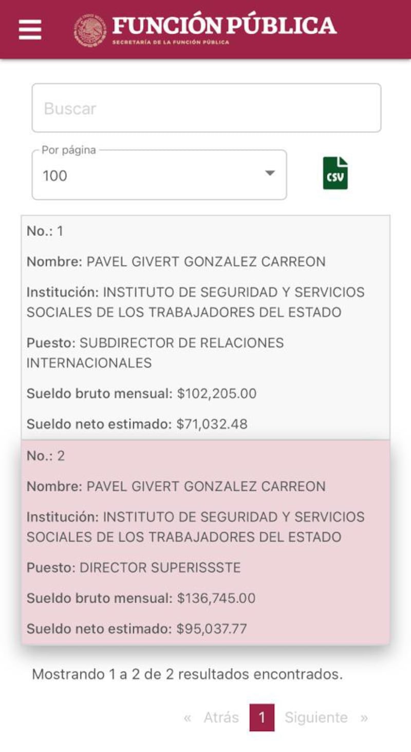 Tampoco pudo decir esta boca es mía sobre el caso de Pável Givert González Carreón, quien tiene dos puestos dentro de lSSSTE por ser familiar de su secretario particular, Samuel González. Cómo dejar de mencionar que, tras realizar la denuncia en redes a la SFP, le desaparecieron uno de los dos empleos de la plataforma de transparencia, pero como no hay crimen perfecto, no se lo quitaron en la nómina.