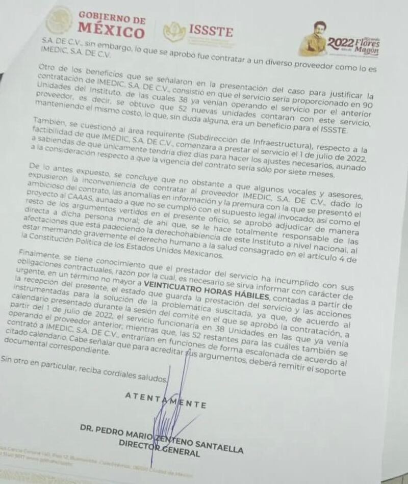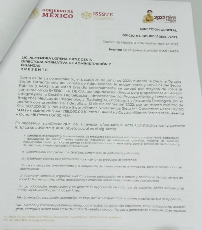 “Para nosotros es un tema que está andando bien, se hizo correctamente”.- Si se hubiera hecho correctamente, no existirían tantos documentos oficiales denunciando la falta de cumplimiento de Imedic, empezando por el oficio No. DG 100.1/0518/2022, del 02/09/2022, que usted mismo le mandó a Almendra Ortiz reclamándole la adjudicación y haciéndola responsable de las consecuencias y afectaciones a los derechohabientes.