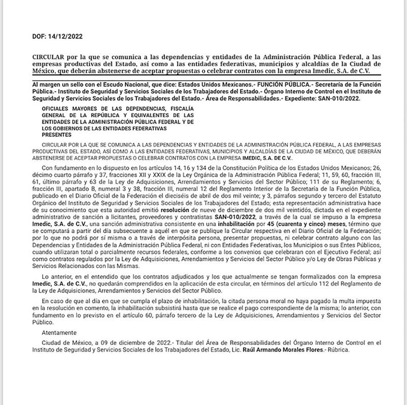 ¿Y la qué?, dirán tanto Pedro Zenteno, director del ISSSTE, como Almendra Ortiz, quienes, de facto, o por sus mentiras o corrupción, serán responsables o corresponsables de las muertes y los pacientes dejados a la deriva que dejó a su paso la adjudicación directa a Imedic de imágenes, endoscopías y biopsias que nunca dio. Aquí les dejo la inhabilitación por 45 meses. Comandante Z, usted, además, tuvo el cinismo de mentir en la comparecencia en la Comisión de Salud en diputados y senadores.