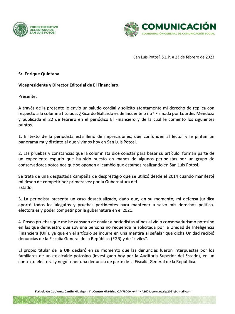 Es muy reveladora, por decir lo menos. La denuncia presentada por el extitular de la UIF Santiago Nieto, quien en agosto de 2020 presentó ante la FGR una denuncia de hechos posiblemente constitutivos de delito donde acusa a los Gallardo (padre e hijo y otros familiares y cómplices, así como a 20 personas morales) de ejecutar “un elaborado esquema mediante el cual se desviaron cantidades millonarias de recursos de los municipios de Soledad de Graciano Sánchez y San Luis Potosí, ambos en el estado del mismo nombre. Dichos recursos, cuyo monto asciende, al menos, a 724,608,296.43 (setecientos veinticuatro millones seiscientos ocho mil doscientos noventa y seis pesos 43/100 moneda nacional)”.
