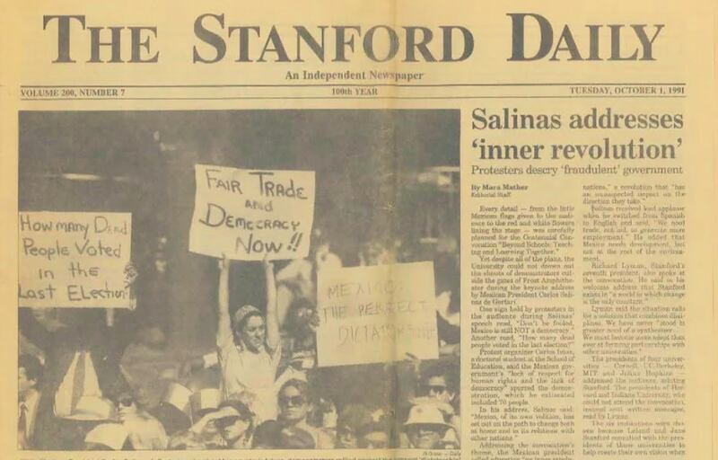 Protesta en septiembre de 1991 en una visita de Carlos Salinas de Gortari a la Universidad de Stanford. La mujer joven con la pancarta era Claudia Sheinbaum, y 33 años después de que demandara democracia será la presidenta de México, y las iniciativas presentadas por AMLO y avaladas por su partido Morena ponen ahora en riesgo los avances logrados en democracia en México que ella misma demandó. Ah, en aquellos años su exesposo, Carlos Imaz, estudiaba su doctorado en Stanford y ella el suyo en UC Berkeley.